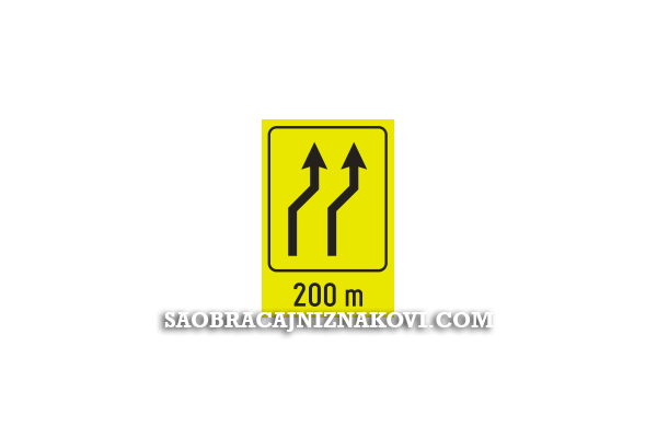 Znak "Skretanje saobraćaja iz jedne kolovozne trake u drugu" označava mjesto, odnosno blizinu mjesta, gdje se vrši skretanje saobraćajnih traka, pri čemu broj saobraćajnih traka ostaje isti. Položaj strelica na znaku mora da odgovara stanju na terenu.